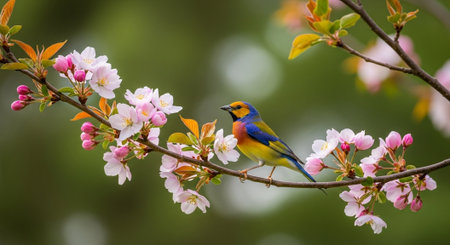 Vibrant bird perched on blossoming dogwood branch in springtime