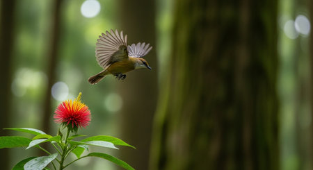 A male european flycatcher (Ficedula hypoleuca) flying near a red flower