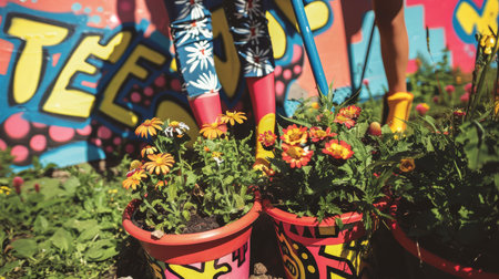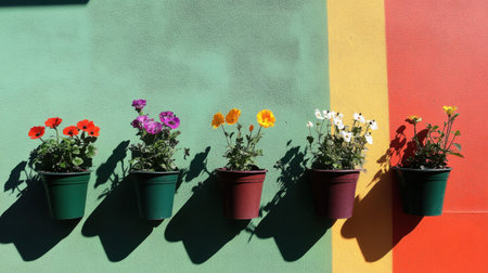 This vibrant image showcases colorful flower pots arranged in a harmonious line against a bright wall, perfect for highlighting the beauty of nature and decor.