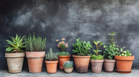 A serene arrangement of indoor plants in terracotta pots showcases vibrant greenery and soft shadows against a neutral wall, creating a tranquil and inviting atmosphere.