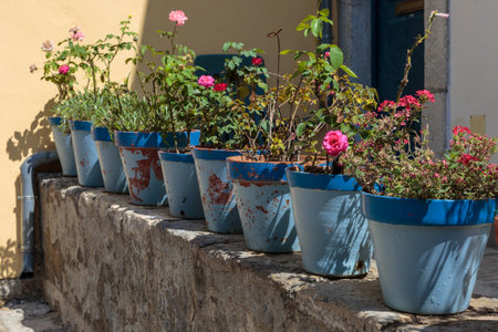 Row of flower pots on an ancient wall in Tuscany, Italy