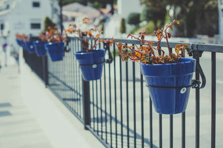 Typical Andalusian white facade, with hanging red pots. Andalusian village, Marbella, Spain
