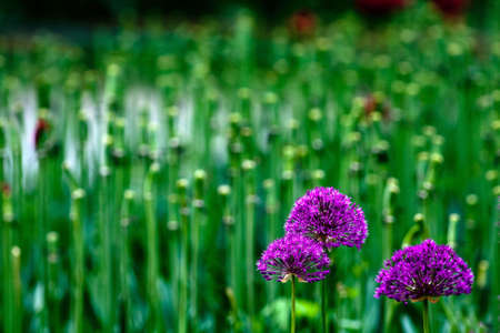Allium flowers growing in the garden. Purple allium flowers. Round purple flowers look like a ball. Blooming onion.