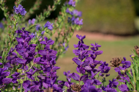 Beautiful blue salvia viridis flowers with leaves in a garden