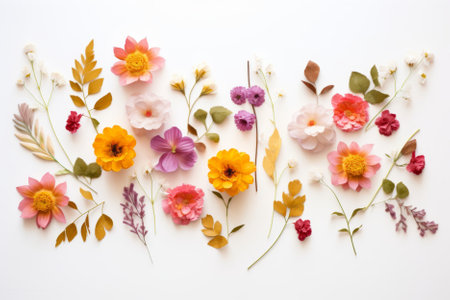 Flat lay with a variety of flowers and leaves on a white background. AI generative