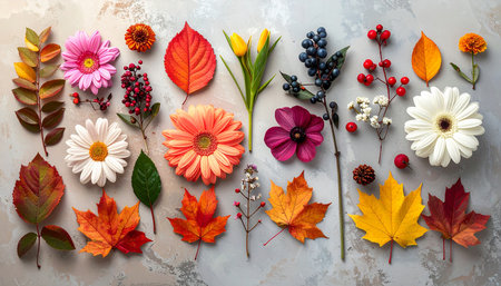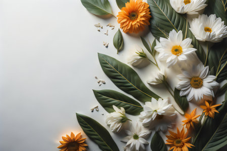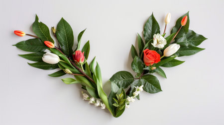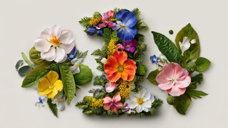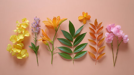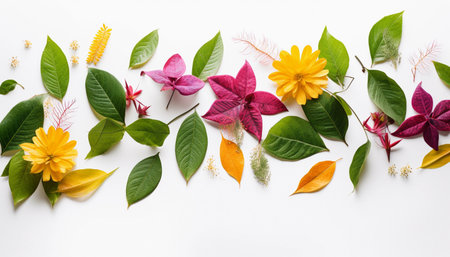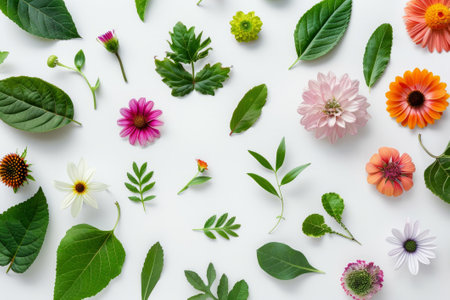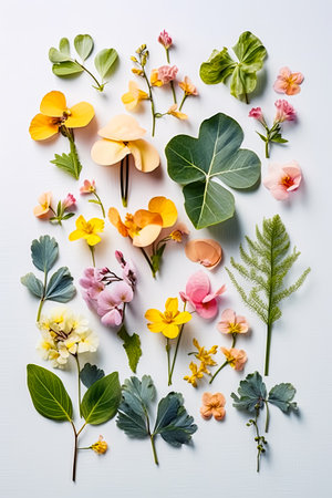 A beautiful display of green leaves and colorful flowers meticulously arranged to create an artistic composition on a light background, perfect for nature-themed projects.