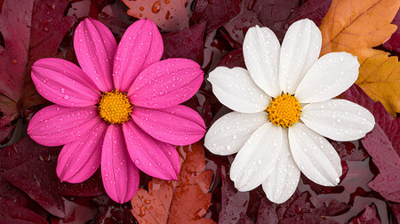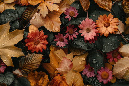 Warm autumn leaves interspersed with cheerful flowers, showing nature's beauty during a gentle rain on a tranquil day.