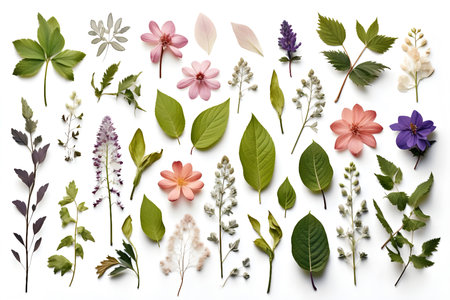 Variety of flowers and leaves in different colors and shapes arranged against a white background