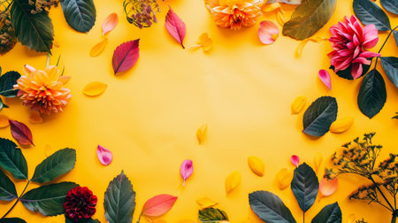 A top-down view of autumn leaves and flowers arranged on a yellow background, showing the beauty and colors of the fall season.