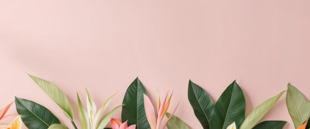 AI Generated. Tropical Flowers and Leaves Border on Pink Background