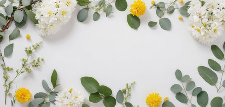 Flowers composition. Frame made of white flowers and eucalyptus branches on white background. Flat lay, top view, copy space