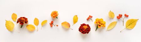 Autumnal composition yellow leaves and flowers on white background, top view, banner. Seasonal autumn flat lay, concept.