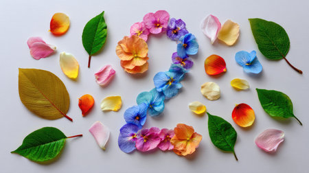 a vibrant flat lay composition featuring colorful flowers, leaves, and the number two arranged in a layout, captured from a top-view perspective for an eye-catching display