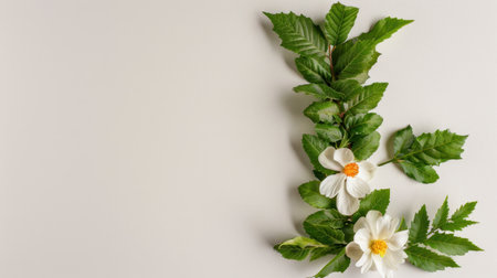 This image features a delicate arrangement of green leaves and white flowers on a neutral background, embodying natural beauty and tranquility, perfect for design projects.
