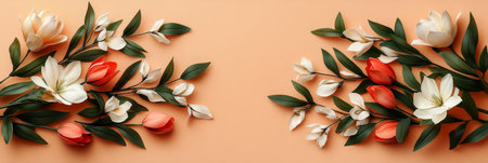 Fresh flowers and lush greenery create a beautiful arrangement along the edges of a neutral background, perfect for events or artistic displays.