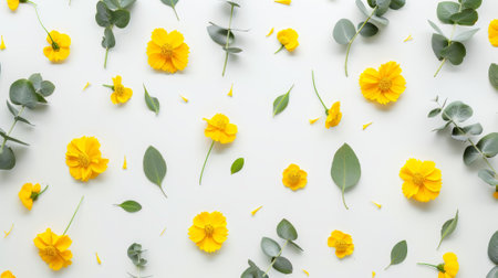 Composition of yellow flowers and leafy eucalyptus on white background. Flat lay, top view..