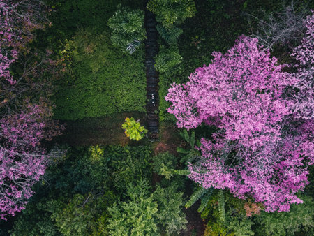 Blossoming cherry trees and their delicate petals scattered on the ground