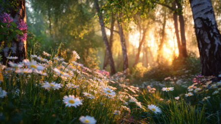 A sunlit forest clearing filled with blooming wildflowers and trees.