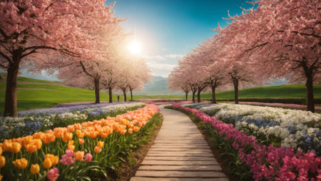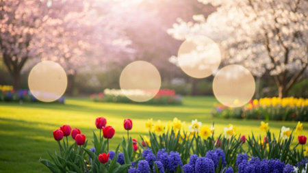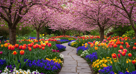 Beautiful spring flowers blooming in a tranquil garden filled with vibrant colors and soft sunlight