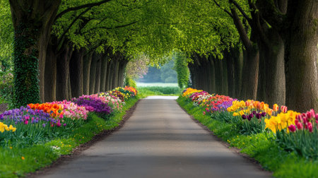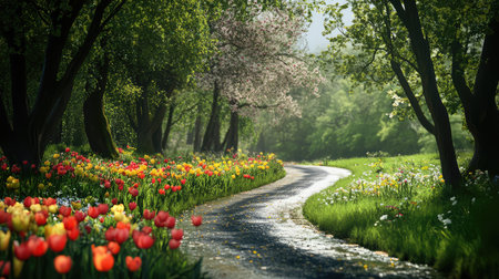 A tranquil pathway flanked by lush green trees and a vibrant array of blooming tulips creates a picturesque spring landscape perfect for nature lovers.