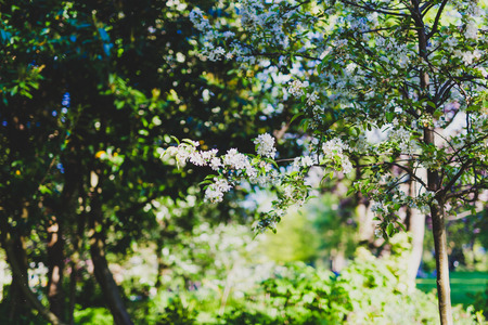 Vintage background of apple tree flowers bloom, floral blossom in sunny spring