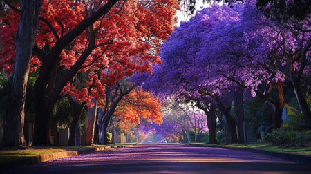 A tranquil street adorned with blooming cherry blossom trees, bathed in soft morning light, creating a picturesque scene that invites peace and beauty in an urban neighborhood.
