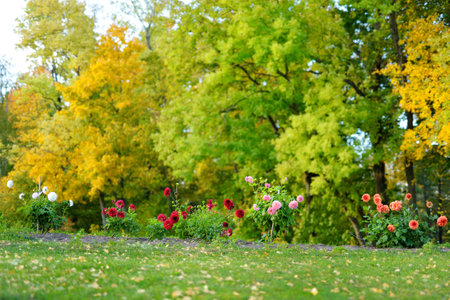 Colourful dahlia flowers in a park garden in autumn. Fall season. Decorative flowers outdoors.