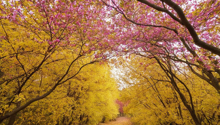 A scenic park path transitions through autumn and spring, with colorful trees and a bench, evoking a sense of peace and natural beauty.