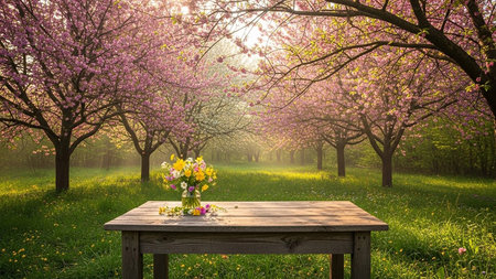 Empty wooden table with beautiful spring flowers in blooming tree garden.