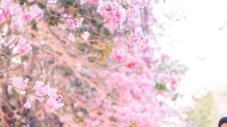 Cherry blossoms in full bloom on a spring day with a blurred background