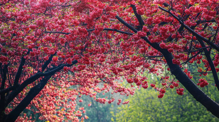 A stunning pathway surrounded by vibrant red blossoms creates a serene atmosphere in this enchanting outdoor scene, perfect for nature lovers.