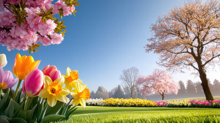 A colorful spring garden in full bloom with tulips, daffodils, and blossoming trees under a clear blue sky.