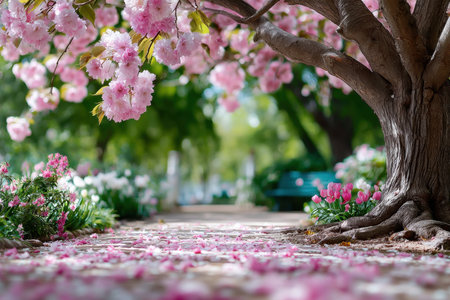 Fallen pink blossoms cover a path in a tranquil garden with flowering trees and tulips