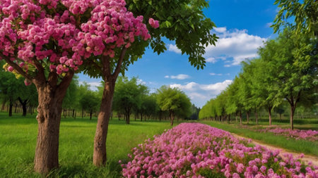 A serene spring landscape featuring cherry blossom trees in full bloom under a clear blue sky, creating a picturesque and tranquil park setting filled with natural beauty.