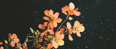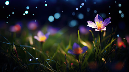 This image showcases delicate flowers in the foreground, illuminated against a dark blue gradient sky. The composition emphasizes soft, natural lighting, and a shallow depth of field. Bokeh lights add to the atmospheric ambiance, suggesting a night or twilight setting. Suitable for various editorial and commercial applications.
