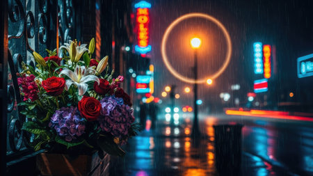 A colorful bouquet of flowers stands in front of a blurred, vibrant cityscape at night. The composition features a shallow depth of field, highlighting the flowers with a backdrop of neon signs and street lights. This image is suitable for various commercial uses, including advertising and editorial content.