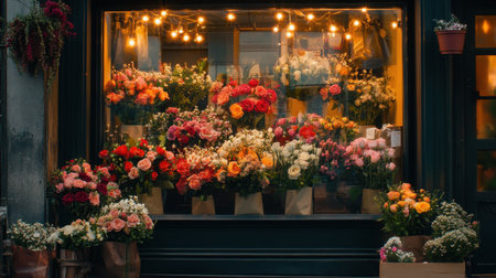 A charming flower shop window with bouquets of colorful blooms, twinkling fairy lights, and vintage decor.