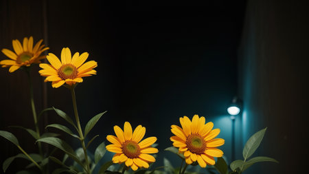 A collection of vivid purple flowers, resembling daisies, are dramatically lit against a deep, dark background. The petals are a striking contrast to the shadows, the viewer's eye to their intricate details. Green stems and leaves provide a natural while the overall composition suggests a magical or ethereal night garden scene.