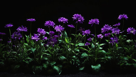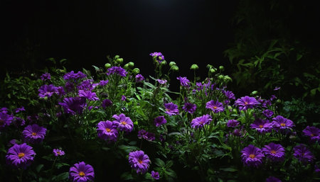 A lush arrangement of vibrant purple daisy-like flowers stands tall against a deep black background. The detailed petals and green foliage are illuminated, creating a striking contrast and a sense of depth. The scene captures the delicate beauty of blooming flora in a garden setting, highlighting the rich colors and natural textures. The overall mood is serene and emphasizing the intricate details of each blossom and leaf.