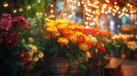 A flower shop display showcasing mixed chrysanthemum bouquets in decorative vases, styled with string lights and greenery.