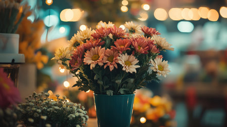This captivating floral arrangement features a stunning mix of colorful flowers, enhanced by soft bokeh lights. Perfect for artistic or seasonal themes.
