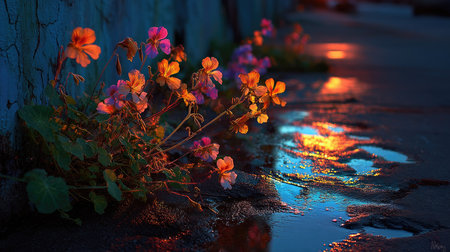 A stunning capture of vibrant flowers breaking through urban asphalt at dusk, enhanced by colorful reflections from nearby puddles, showcasing nature's resilience.
