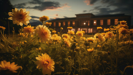 flowers bloom behind a house in the evening, showcasing a serene pastoral scene. the dark yellow and amber hues create an emotive field of color reminiscent of classic academia. this japanese photography, rendered in cinema4d, captures the beauty of nature in a style that exudes the essence of science academia. ai generated