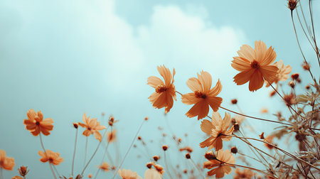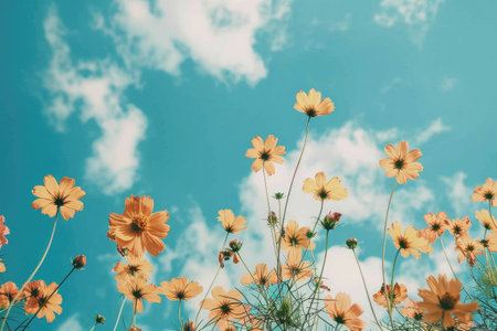 Cosmos flowers with blue sky background, vintage filter effect applied.