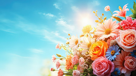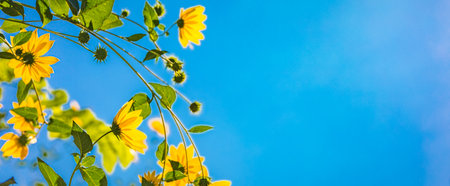 Vibrant Blooms Against a Clear Blue Sky, Summer Floral Composition on Nature Background