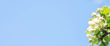 Banner with branch of flowering white apple tree. Beautiful bloom garden with copy space.