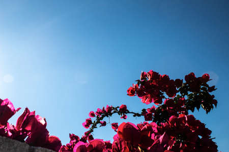 Bougainvillea, or Bougavillia, exotic flowering shrub in vibrant pink shade of colour in Crete, Greece against a clear blue sky.