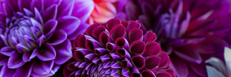 Dahlia blooms background. Colorful dahlia flowers close up. Floral banner.