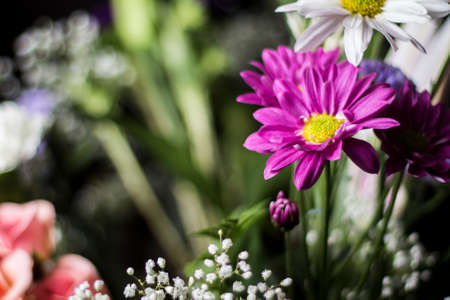 Bunch of Pink tulips white gerbera daisy bouquet of mixed flowers. Fresh spring Summer background
