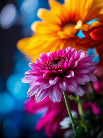 A stunning close-up capture of a vibrant floral arrangement featuring a delightful mix of blossoms in shades of pink, orange, and blue. Perfect for seasonal themes.